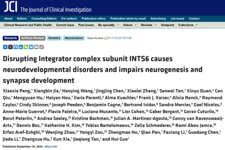 近日,中南大学郭辉课题组、谭洁琼课题组和南华大学/中南大学夏昆课题组,在国际权威期刊《临床研究杂志》(Journal of Clinical Investigation)在线发表题为“整合子亚基INTS6功能缺失导致神经发育障碍和神经发生及突触发育异常”(Disrupting Integrator complex subunit INTS6 causes neurodevelopmental disorders and impairs neurogenesis and synapse development)的研究论文。该成果首次明确整合子复合物亚基编码基因INTS6是神经发育关键调控基因,为神经发育障碍(NDD)精准诊疗与干预提供新方向。