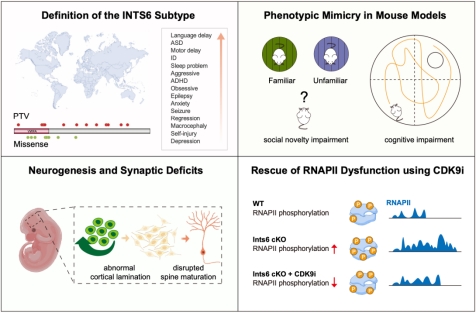 神经发育障碍(NDD)涵盖孤独症谱系障碍、智力障碍等多种疾病,临床和遗传异质性高。该研究中,团队联合9个国家35个单位开展国际多中心合作,共发现24例INTS6变异患者。通过临床表型分析,明确语言障碍、孤独症、运动发育迟缓等是该基因突变的主要表现。为解析INTS6的生物学功能,团队构建Ints6神经系统条件敲除小鼠模型。研究发现,Ints6缺失会导致RNA聚合酶II(RNAPII)异常聚集及细胞周期基因转录紊乱;杂合敲除小鼠出现社交和认知障碍等症状;Ints6单倍剂量不足会损害树突棘发育成熟,而突变型INTS6无法恢复该表型。分子机制层面,团队证实Ints6协同磷酸酶(PP2A)拮抗细胞周期蛋白依赖性激酶9(CDK9),共同调控RNAPII磷酸化与转录暂停-释放,且应用CDK9抑制剂可部分逆转突触发育异常。该研究从临床遗传学角度定义了NDD新分子亚型,为精准诊疗提供数据基础;从分子机制层面为神经发育障碍干预提供潜在靶点。